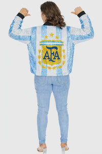 Designed by the Sequin Fans brand, this stunning Argentina World Cup Sequin jacket beautifully showcases your love for the Argentina World Cup team. Step onto the field or into any game day event with confidence and style with this sports glam World Cup jersey jacket, perfect for parties that go from day to night.