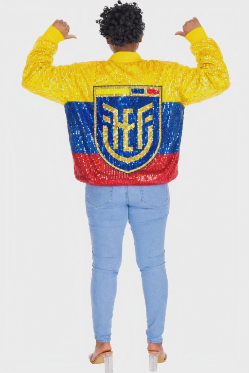 Designed by the Sequin Fans brand, this stunning Ecuador World Cup Sequin jacket beautifully showcases your love for the Ecuador World Cup team. Step onto the field or into any game day event with confidence and style with this sports glam World Cup jersey jacket, perfect for parties that go from day to night.