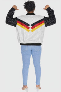 Designed by the Sequin Fans brand, this stunning Germany World Cup Sequin jacket beautifully showcases your love for the Germany World Cup team. Step onto the field or into any game day event with confidence and style with this sports glam World Cup jersey jacket, perfect for parties that go from day to night.