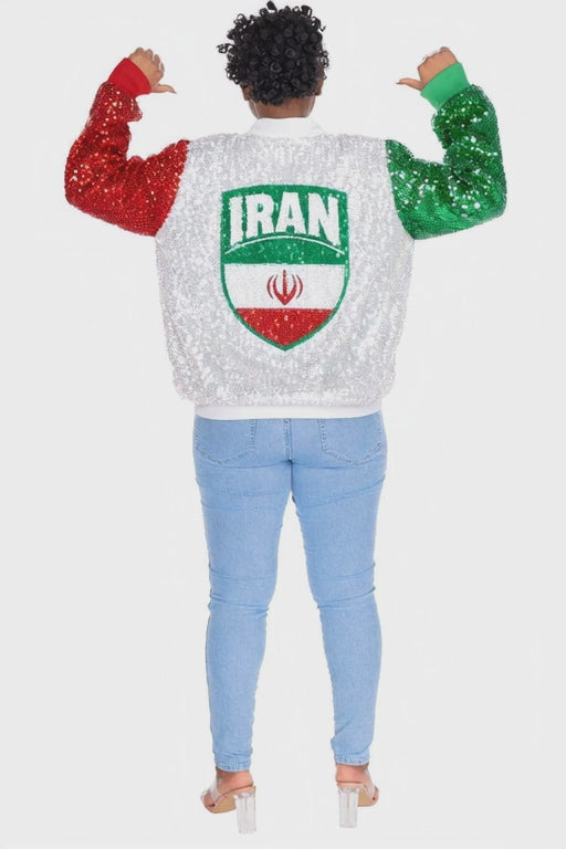 Designed by the Sequin Fans brand, this stunning Iran World Cup Sequin jacket beautifully showcases your love for the Iran World Cup team. Step onto the field or into any game day event with confidence and style with this sports glam World Cup jersey jacket, perfect for parties that go from day to night.