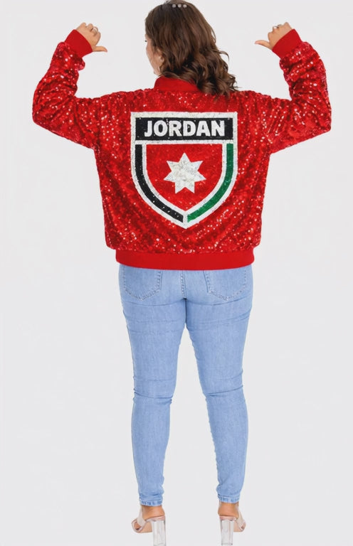 Designed by the Sequin Fans brand, this stunning Jordan World Cup Sequin jacket beautifully showcases your love for the Jordan World Cup team. Step onto the field or into any game day event with confidence and style with this sports glam World Cup jersey jacket, perfect for parties that go from day to night.