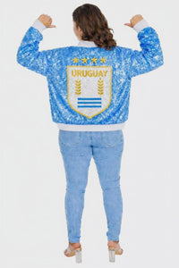 Designed by the Sequin Fans brand, this stunning Uruguay World Cup Sequin jacket beautifully showcases your love for the Uruguay World Cup team. Step onto the field or into any game day event with confidence and style with this sports glam World Cup jersey jacket, perfect for parties that go from day to night.