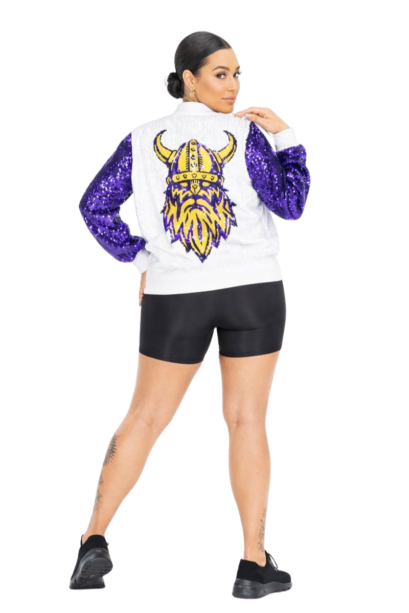 Elevate your game day style with our Minnesota Football Sequin Jacket, a stunning ensemble that fuses fashion and team spirit! This sports jersey jacket perfectly captures your love for your team and will make you shine brighter than ever with beautiful sequins. Perfect for watch parties, tailgates, and being inside the stadium, you can easily radiate team pride alongside glamorous style!